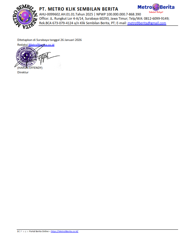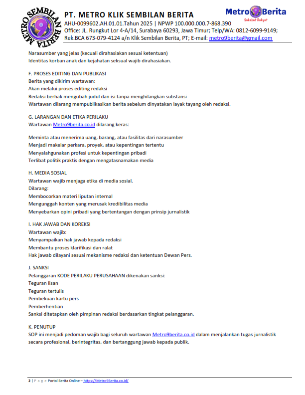 SOP ini menjadi pedoman wajib bagi seluruh wartawan Metro9berita.co.id dalam menjalankan tugas jurnalistik secara profesional, berintegritas, dan bertanggung jawab kepada publik.